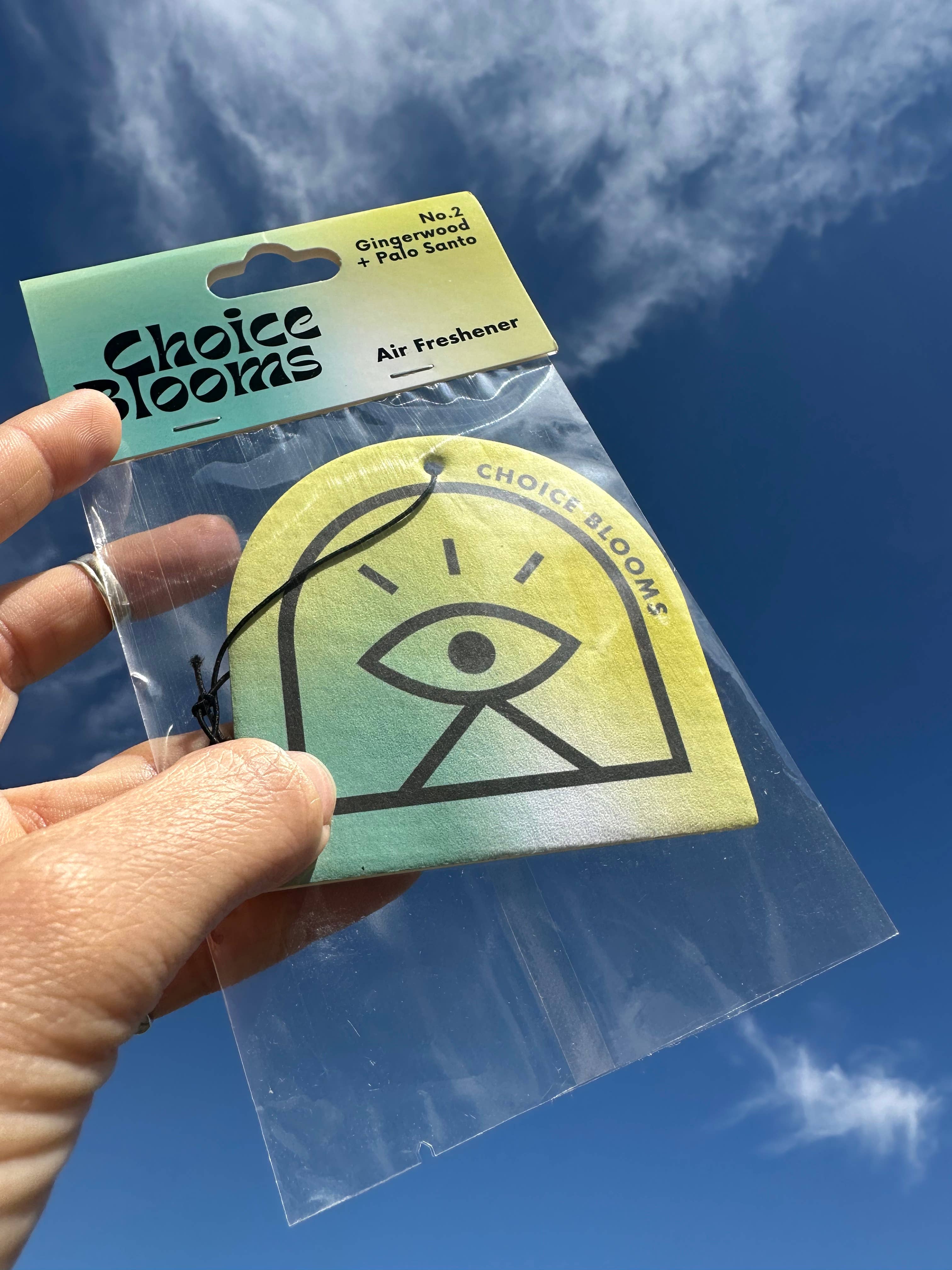 ir Freshener No. 2 Gingerwood & Palo Santo made with recycled paperboard + fine fragrance + essential oils. Non-toxic phthalate + paraben-free. Meant for hanging on the rearview mirror of your automobile, + are also suitable in other small spaces like bathrooms, closets,+ Each Car Fragrance lasts 2-3 weeks depending on use + conditions it is hanging in. Direct sunlight and high heat can make your freshener color fade + its scent strength + longevity span shorter. Avoid direct contact with textiles + surfaces. To store in small spaces, we suggest snipping off the top of the inside barrier bag while keeping the freshener inside to avoid direct contact with textiles + surfaces. The Smell: No. 2:Gingerwood + Palo Santo Top: Cassis Nectar, Pomegranate, Camphor Heart: Arabian Rose,Red Clay, Cedarwood Base: Palo Santo,Terra-cotta Amber,Musk.