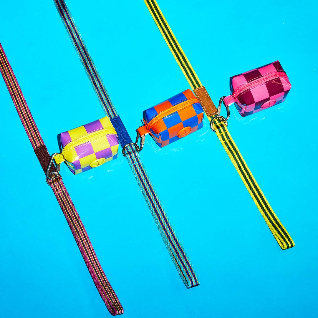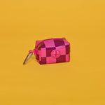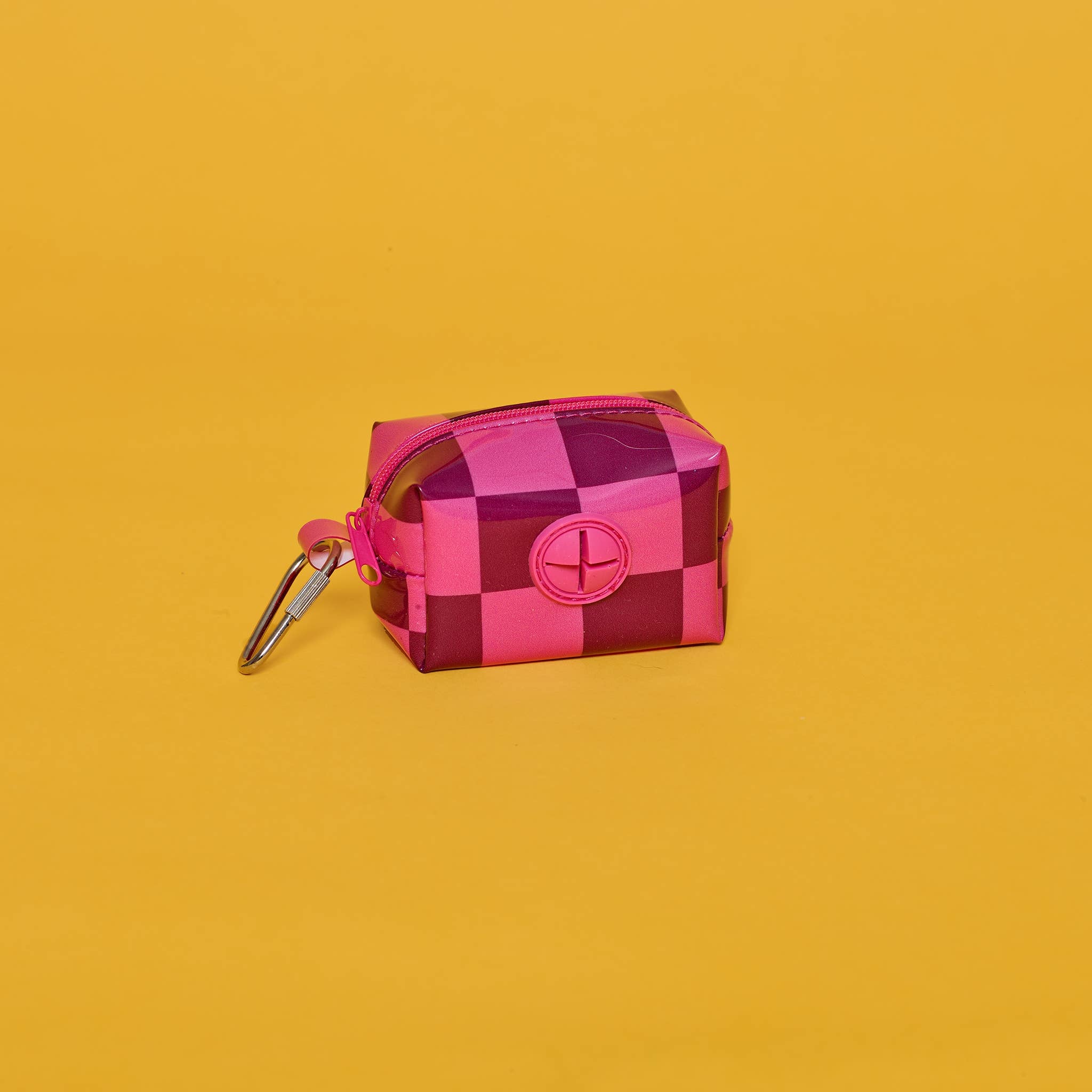 Our custom printed checkered vinyl pouch adds fun to any walk. It clips on to your leash and holds a roll of baggies with room for treats and keys. There is an easy pink zipper closure and a pink colored grommet for easy bag access. Available in 3 different color combos. Pink and Burgandy checkered Vinyl Pouch Dimensions: 3” x 2” Wipe Clean Contrasting pink colored zipper