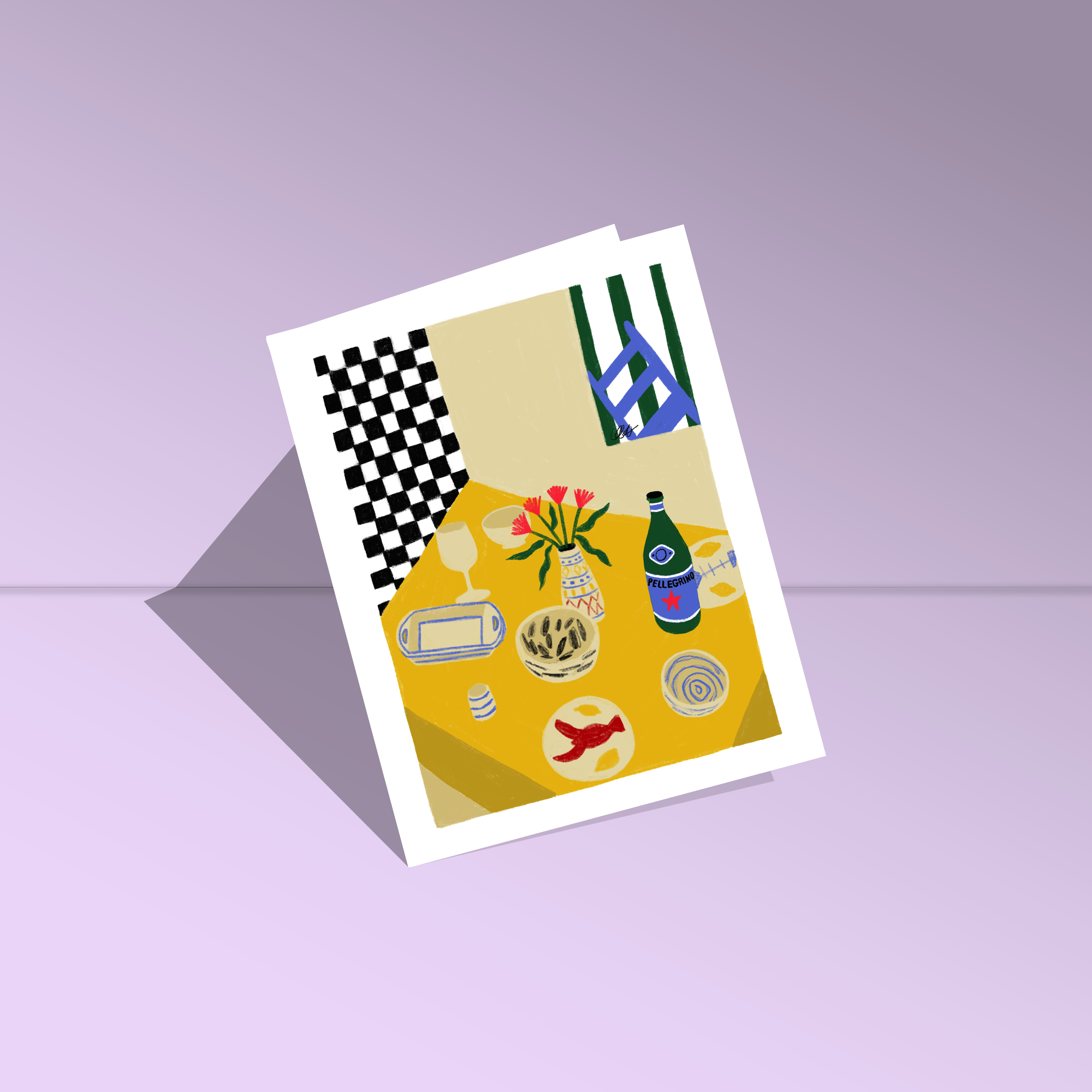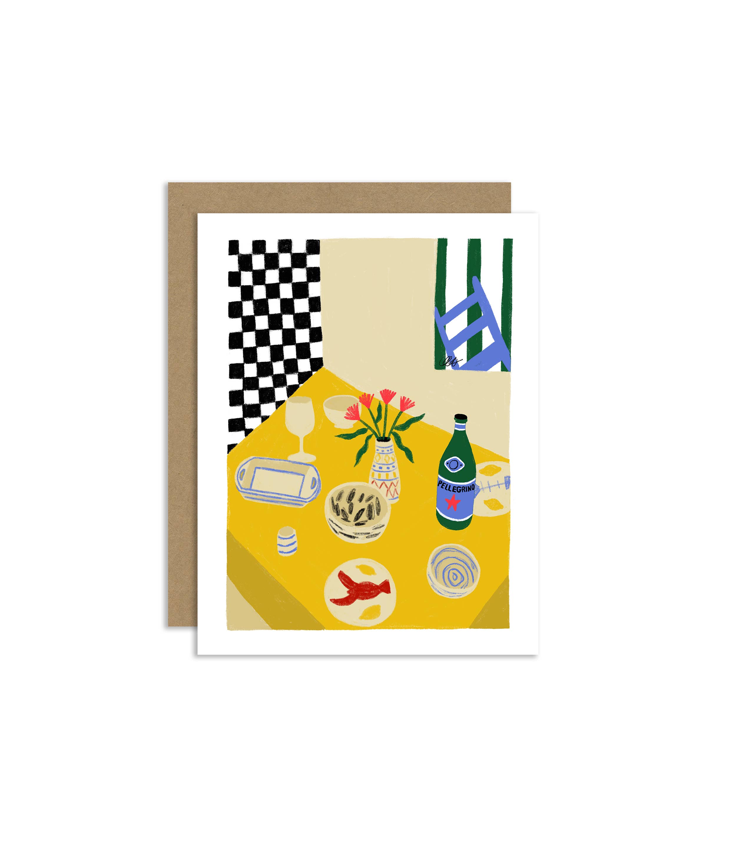 A2 (5.5 x 4.25") art card of one of our best selling prints, "Dining Table". Comes with a kraft envelope, and is blank inside. Packaged in an acid-free plastic sleeve. All greeting cards are designed, printed and packaged by hand in Allison's home studio.