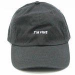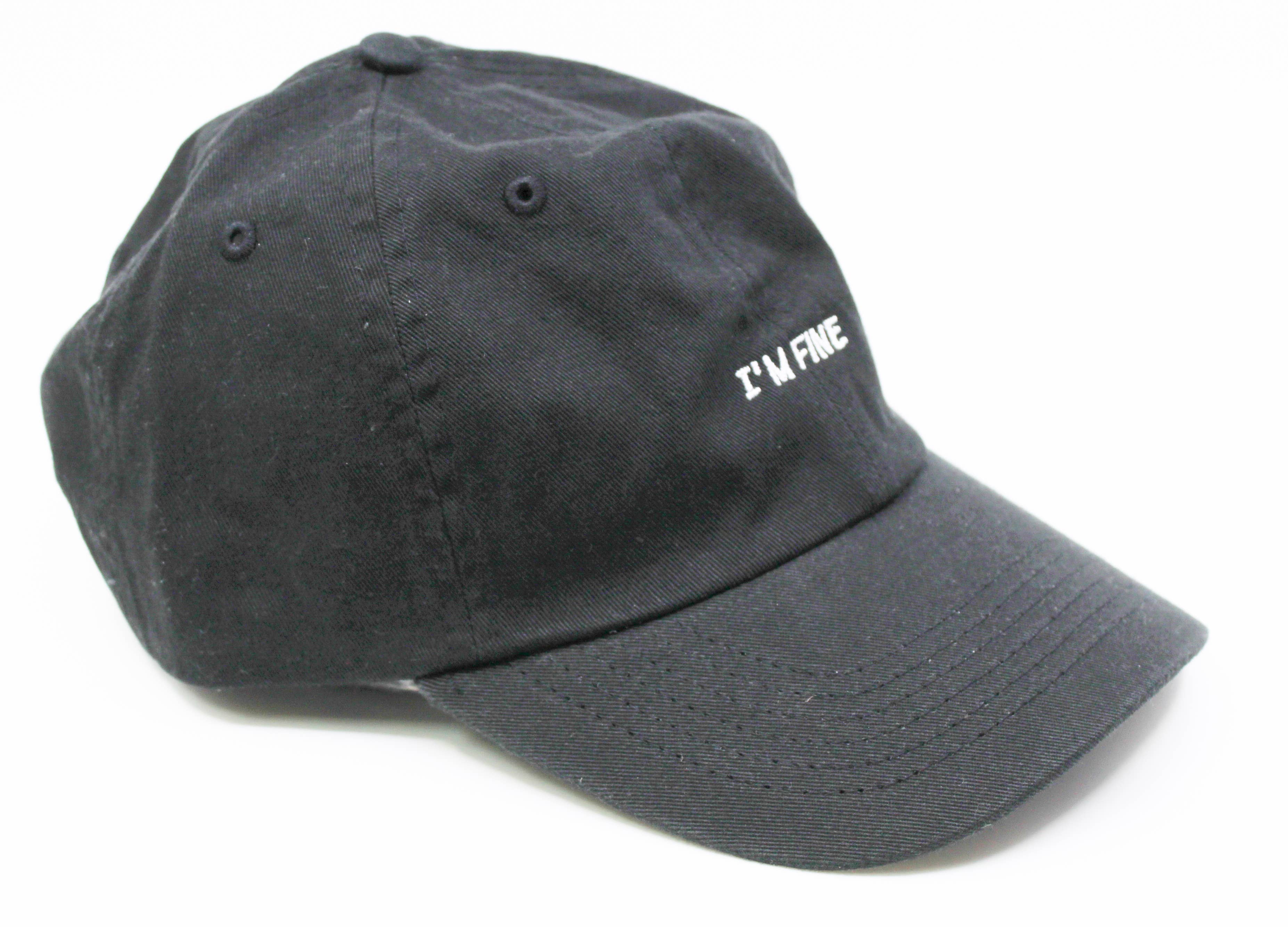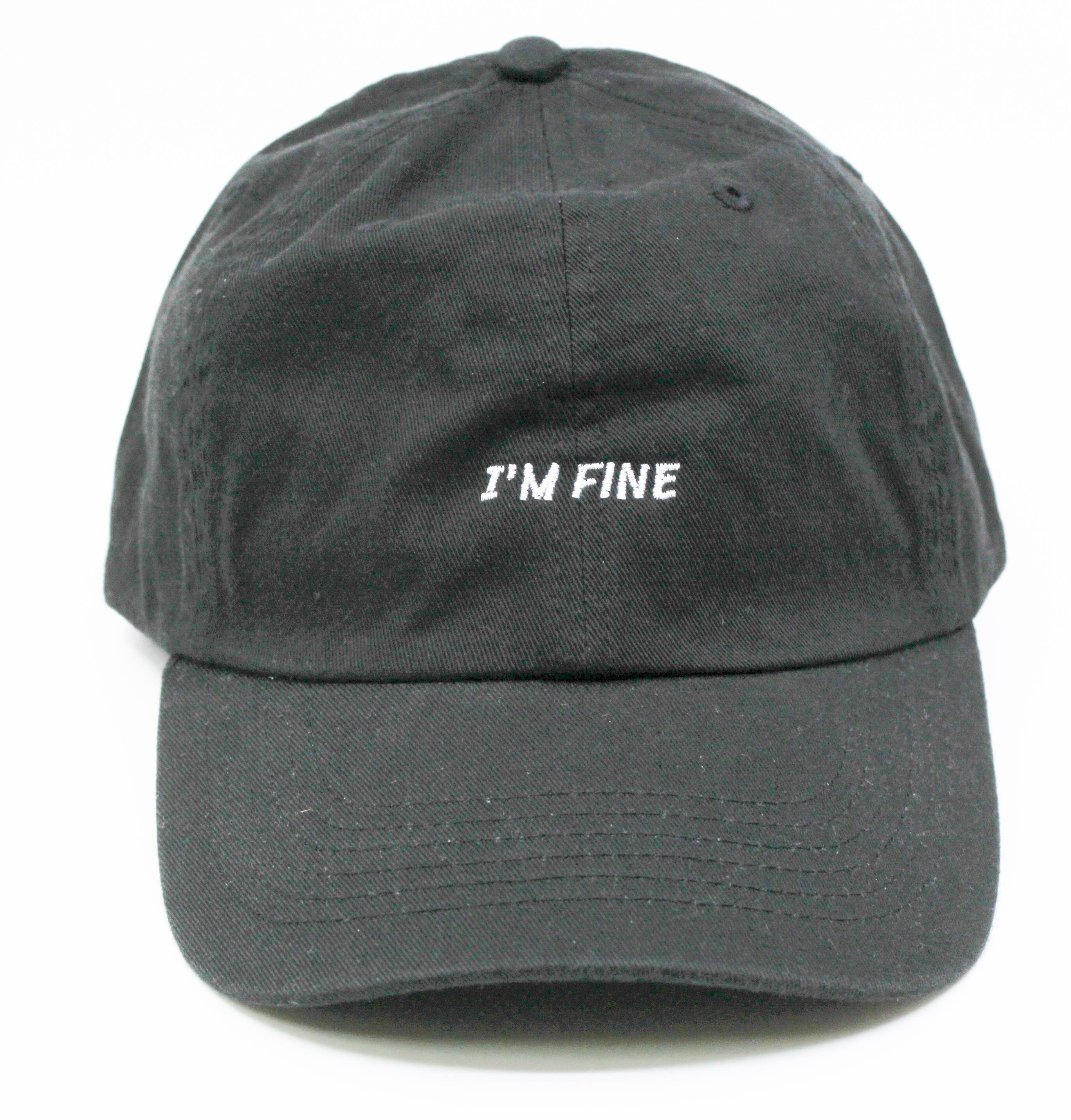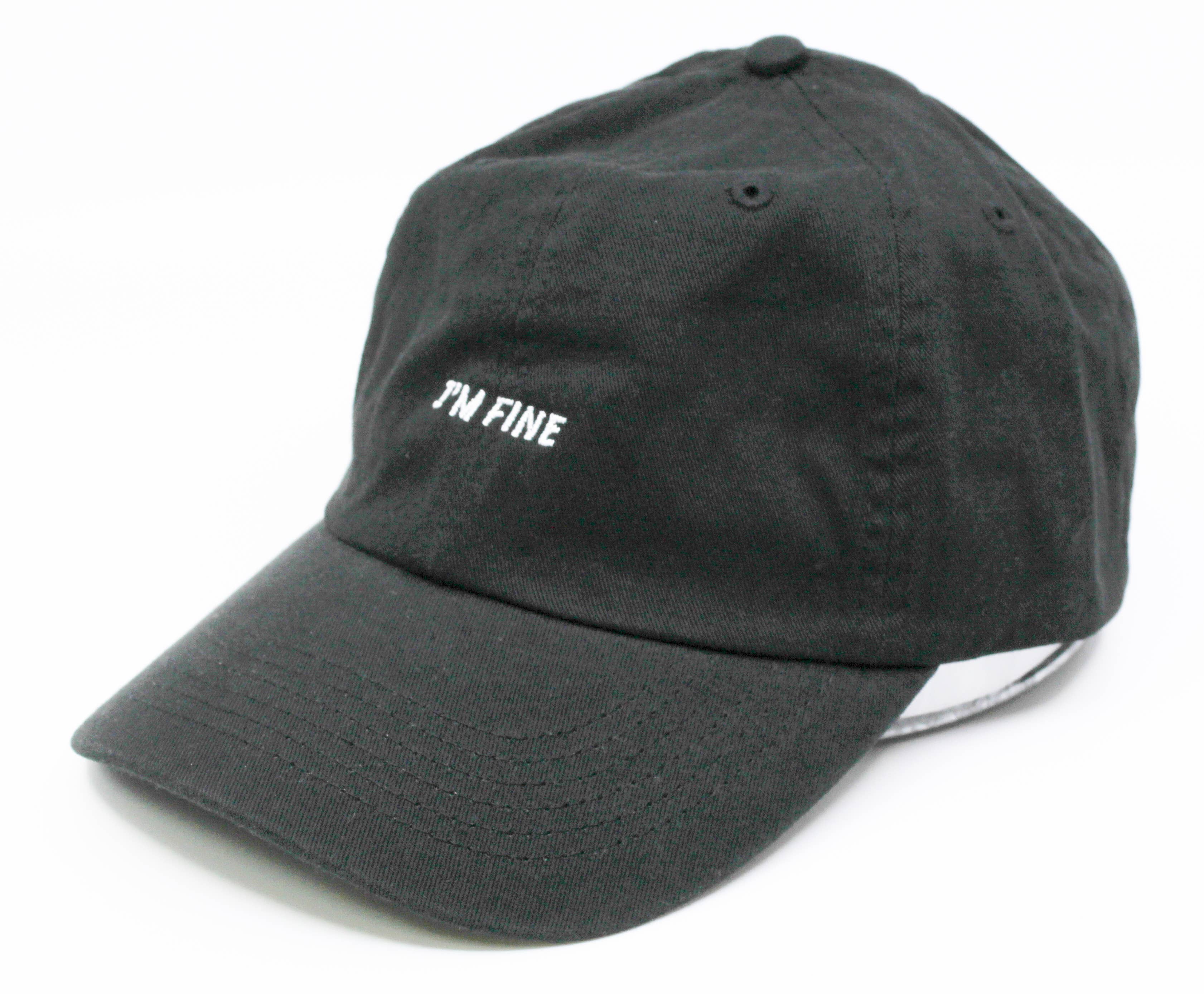 One size fits most. Adjustable. Lettering embroidered directly onto the hat. Black colored hat with white thread used to embroider the words "I'm Fine" onto the hat. Y’know, everything is just fine when you say "I'm Fine". 100% cotton, with an adjustable metal back strap and clasp. Created and Designed by Ari Campanella for Standard Goods