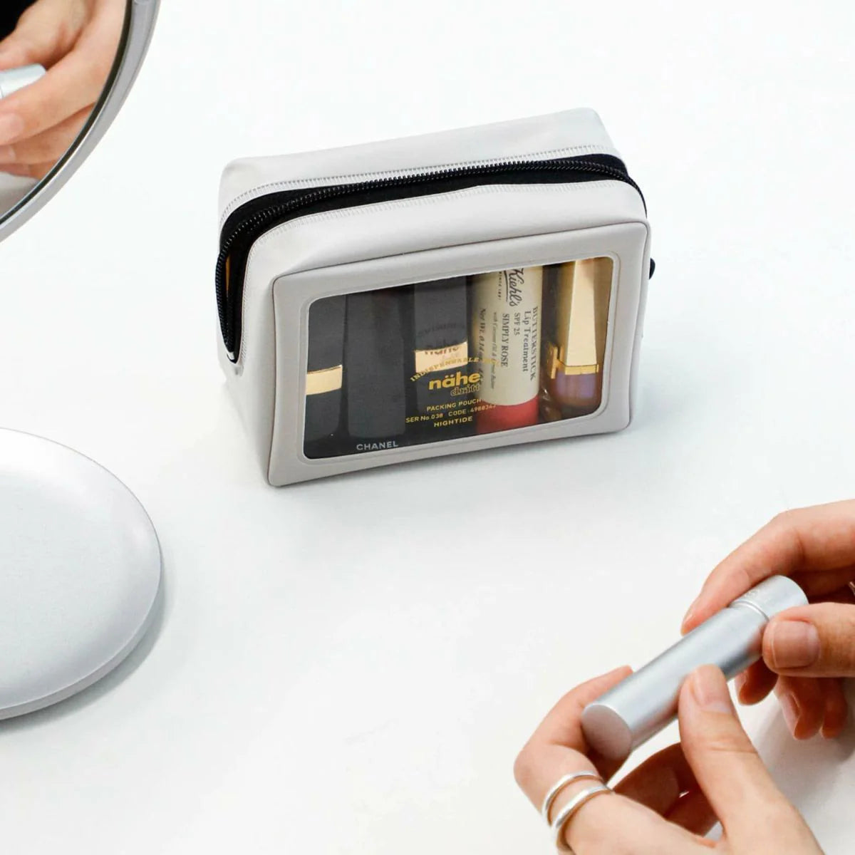 A zippered pouch made of PVC with a transparent front by Hightide. Comes with a slit pocket on the inside and back.