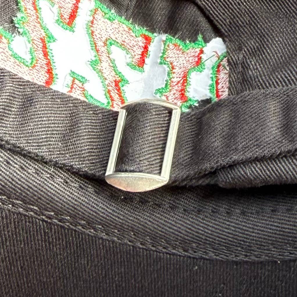 One size fits most hat in black with red and green embroidery