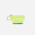 Two-tone raffia mini pouch. A cute and functional addition to your keys, bag, or backpack. Finished with a round carabiner and top zipper. Details Body: 100% Viscose Spot clean with soapy water, wipe clean