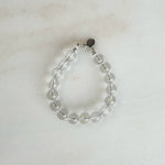 Quartz bracelet with magnetic clasp designed for attaching with ease. Handmade. Materials: 10mm clear quartz round beads. Wire cord with sterling silver hardware. (Pictured wearing 7”).