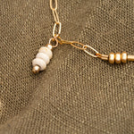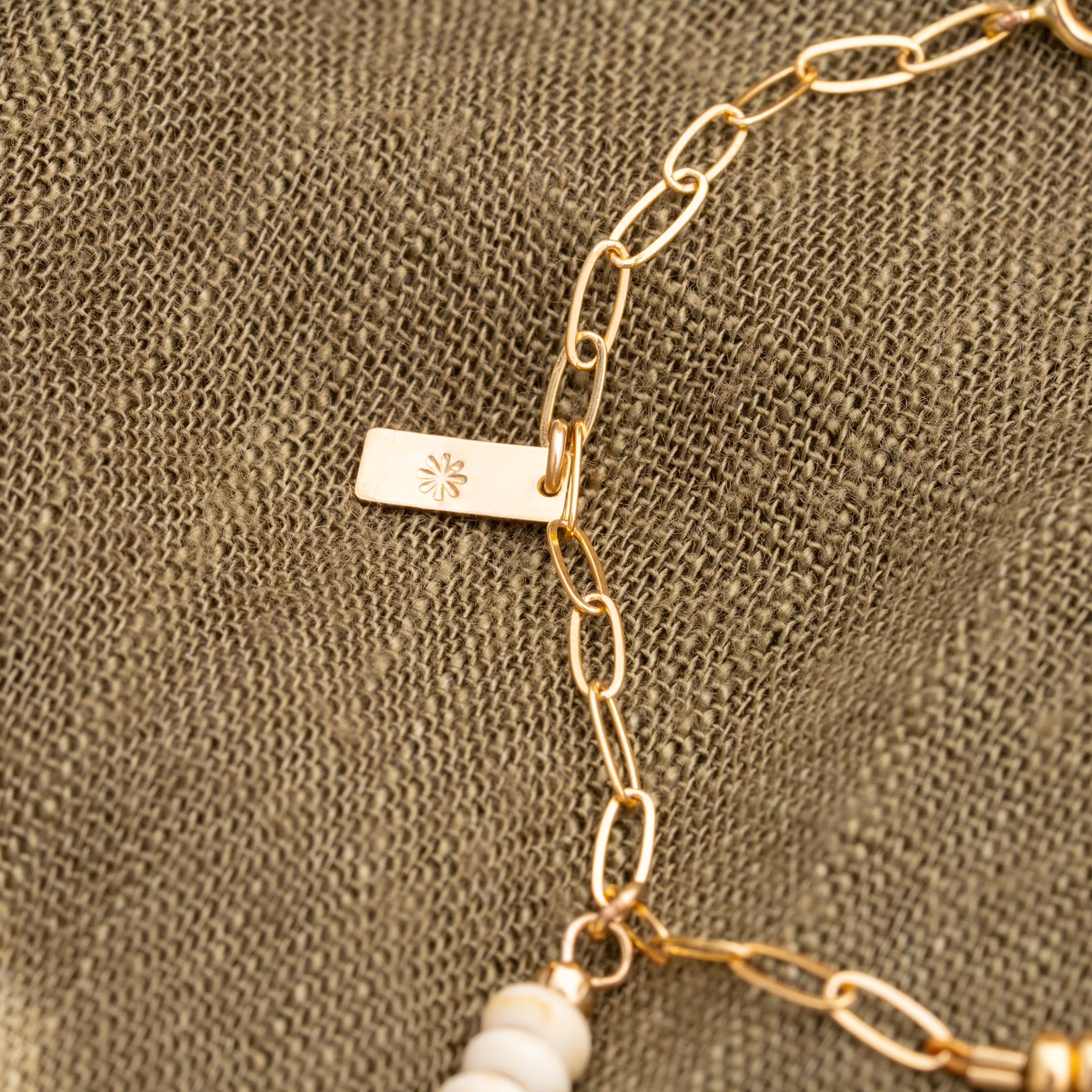 This dainty charm bracelet is 14k gold-filled with stone beads and mother of pearl beads.