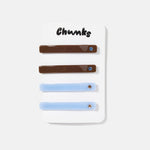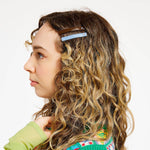 These slide-style barrettes have no clasp. Just pry them open a bit and slide them on for a pop of color. Perfect for taming bangs and flyaways. Made from high quality acetate; a durable, plant based bio-plastic. Metal hardware is lead and nickel-free. Slight variations will appear with pattern, color and form due to the handmade nature of the product. Measures approx 2.5"L x 0.25"H x 0.25"D Color: brown, light blue, silver tone hardware
