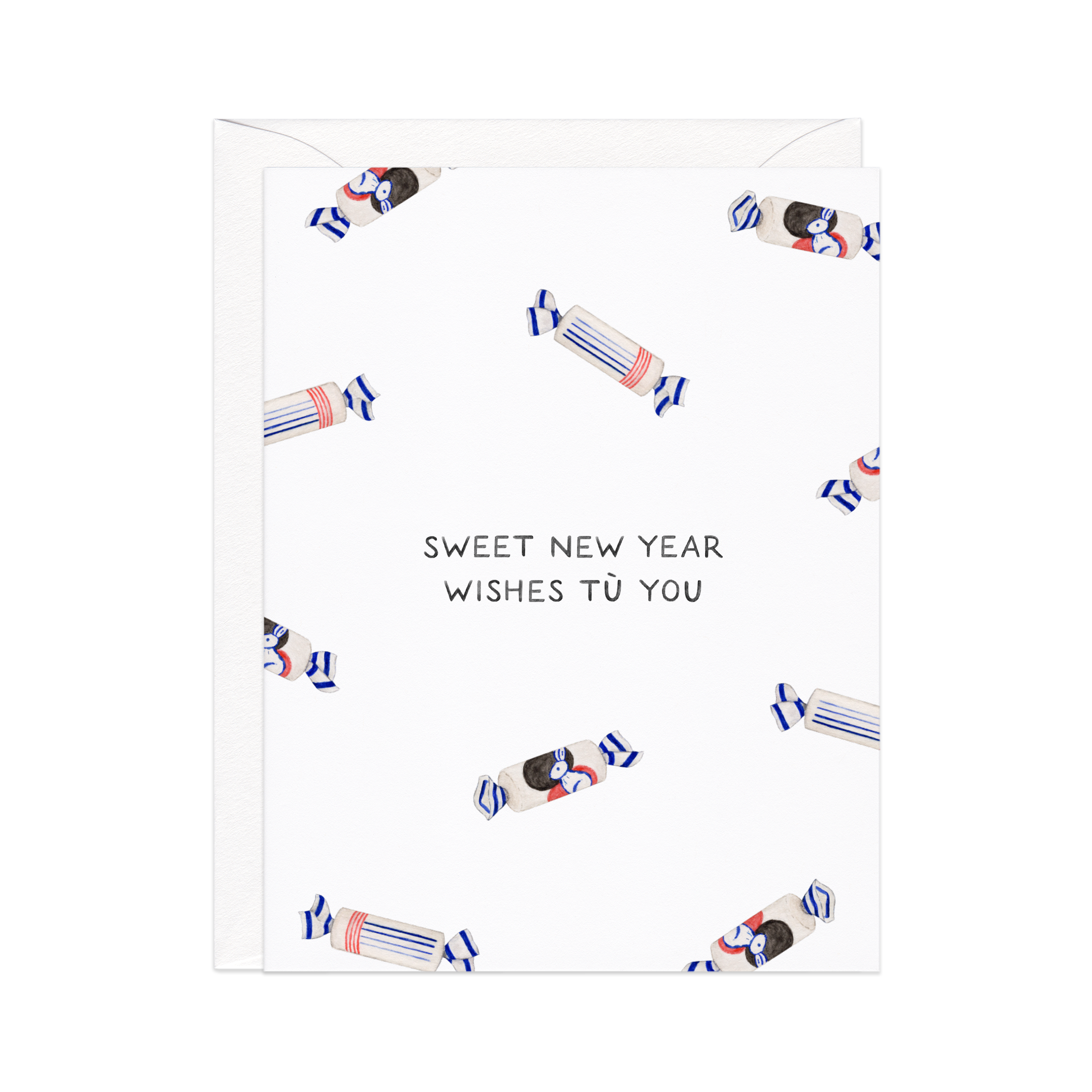 This New Years card features a nostalgic White Rabbit candy pattern, paired with a sweet, celebratory pun. Great for: New Years, Lunar New Year, AAPI kids, third culture kids All Amy Zhang products feature original watercolor illustrations and are painted, designed, and packaged in-house in New Hampshire. Greeting cards are printed in New England on locally-sourced paper. DETAILS — - Single folded greeting card (blank inside) - Card measures 4.25" x 5.5" (A2 size) - Matching white or red envelope included - Card and envelope are packaged in open top clear sleeve