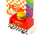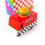 Order Up! We’ve got a #1 and a side of fries! Our Patty’s Van is complete with a bun and all the fixings. This squishy bun topper is absolutely too cute for words. We're getting hungry just looking at it. Materials & Info: Solid Beech Wood, water-based paint and clear urethane coat. ABS plastic wheels. Safety tested according to US CPSIA and European, Australian and New Zealand regulations. Not for children under 3 years of age. Dimensions: 3.3" L x 1.6" W x 2.6" H (8.4cm L x 4cm W x 6.6cm H) Weight: 6oz (170g) Packaging: 3.7" L x 1.7" W x 3.7" H (9.4cm L x 4.3cm W x 9.4cm H) See it in action here: Keywords: pattys, patty, Patty's, patty's, Hamburger, hamburger, burger van, hamburger van, Hamburger Van, Patty Van, Patty's Van, patty van, Patty van,