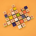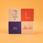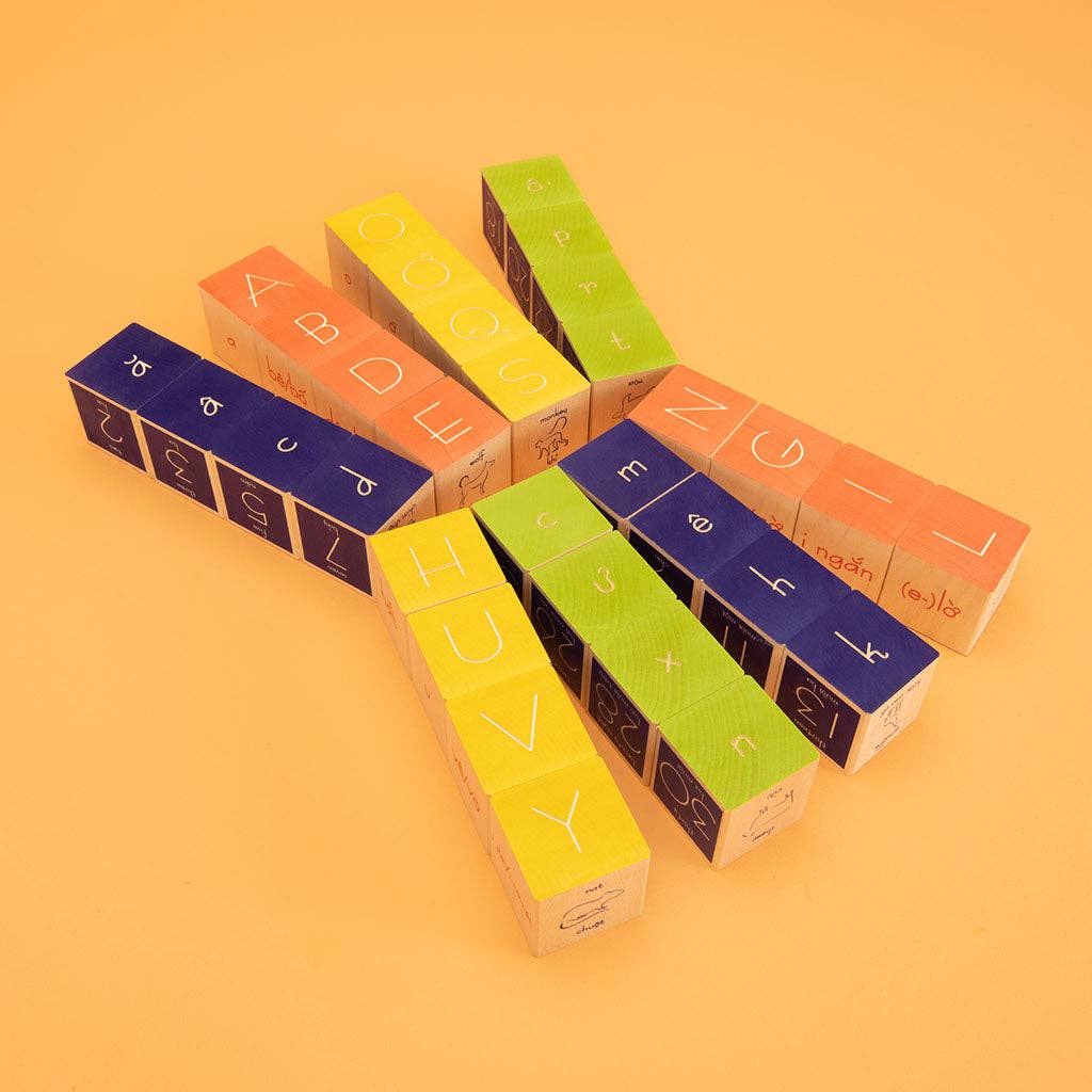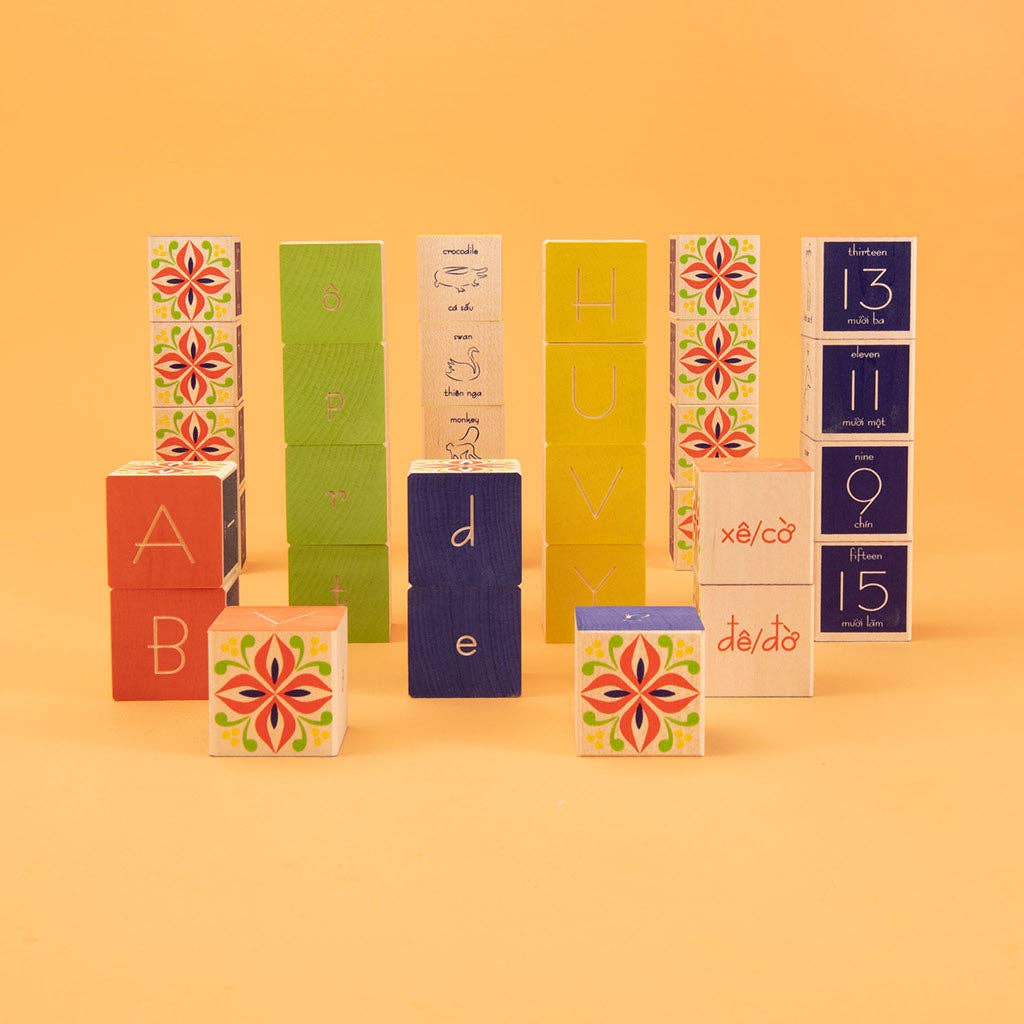 Explore Vietnam and the Vietnamese language. Each block reveals a hand drawn animal paired with Vietnamese and English translations. Count numbers 1-32 with their printed phonetic Vietnamese pronunciation. Enjoy bold colors and semi-traditional patterns. This set includes an extra N, H, and C; the most popular letters in the Vietnamese alphabet. See and feel two debossed letters on each block: one upper case, one lower. * 32 - 1.75 inch cubes * Made using sustainable Midwestern basswood * Printed with safe-to-touch inks * 100% made in the USA * Ages 2+