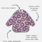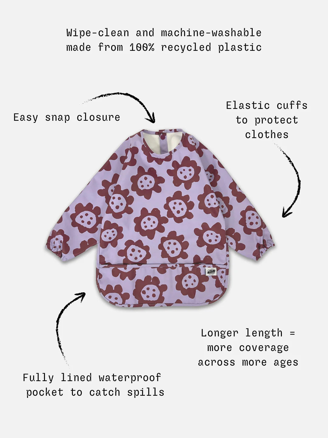 Long sleeve smock bibs in six artist-designed colorways, perfect for messy eaters and little artists alike. Made from 100% recycled materials, these waterproof outfit-savers fit ages 6 months to 3 years.