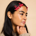 Four mini metal snap clips wrapped up in ribbon, topped with a bow. Perfect for all hair types and textures. Metal hardware is lead and nickel-free. Measures 1.75""L x 1.5""H x 0.25""D Color: red, silver-tone hardware
