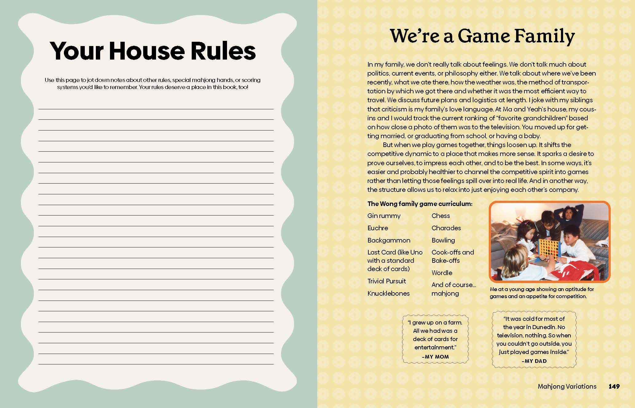 For many third-culture kids in the Asian diaspora, the sight and sound of clacking mahjong tiles conjures deep-seated memories. Some learned to play alongside elders, while others watched from afar. Maybe you only distantly know of the game through movies or articles about pop-up mahjong nights. Whether you are looking to reconnect with the game, pick up a new hobby, or introduce others to a favorite pastime, Mahjong is a step-by-step guide for new and seasoned players alike. With vibrant photography and detailed instructional diagrams, author Nicole Wong walks you through gameplay, just how her grandfather would have. In addition, Mahjong delves into the strategy, history, and design of the game and discusses various popular styles of play (American mah-jongg, Japanese riichi mahjong, and more).