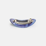 A classic oval shaped barrette. The curved french clip style is perfect for half holds on all types of hair. Made from high quality acetate; a durable, plant based bio-plastic. Metal hardware is lead and nickel-free. Slight variations will appear with pattern, color and form due to the handmade nature of the product. Measures approx 3.5" W x 1.5" H x 1" D Color: black, blue, silver tone hardware