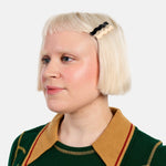These slide-style barrettes have no clasp. Just pry them open a bit and slide them on for a pop of color. Perfect for taming bangs and flyaways. Made from high quality acetate; a durable, plant based bio-plastic. Metal hardware is lead and nickel-free. Slight variations will appear with pattern, color and form due to the handmade nature of the product. Measures approx 2.5"L x 0.25"H x 0.25"D Color: cream, black, silver tone hardware