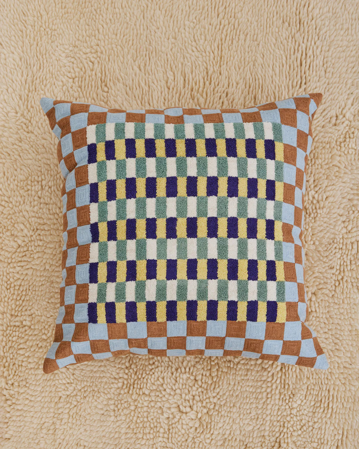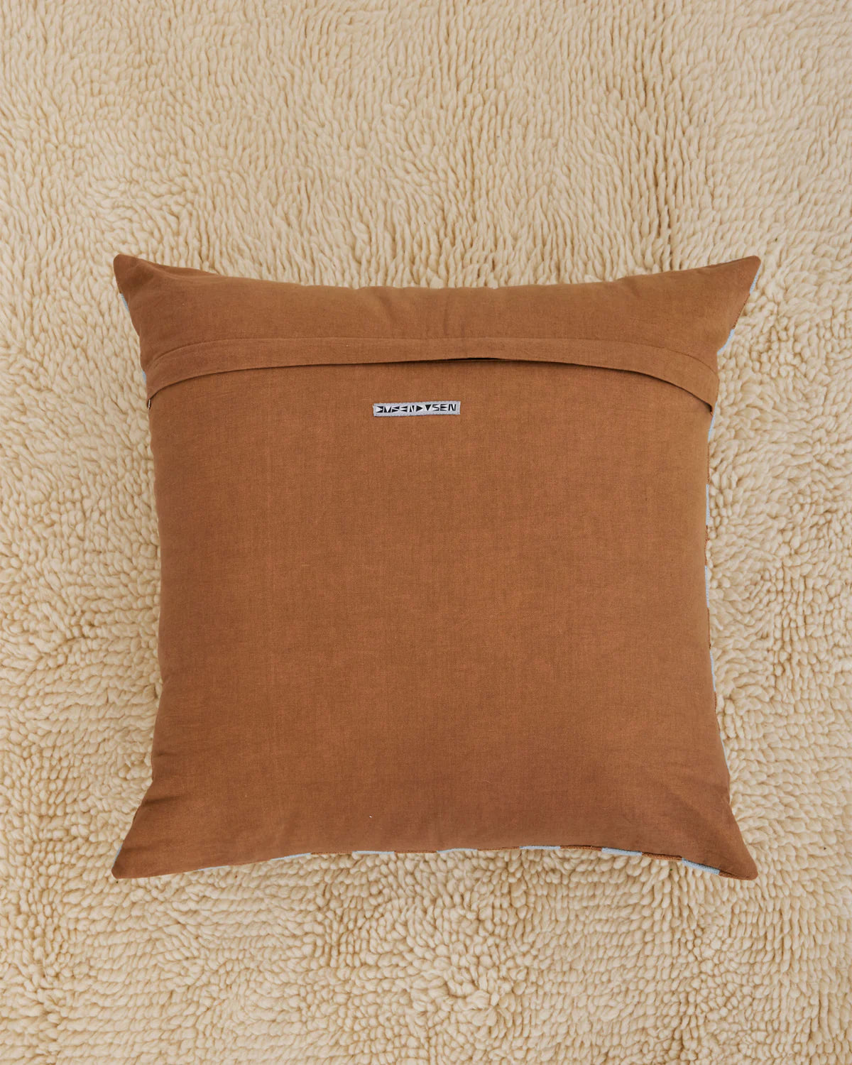 100% cotton embroidery and tufting. Non-embroidered natural canvas back with a zipper opening. Made in India.