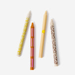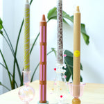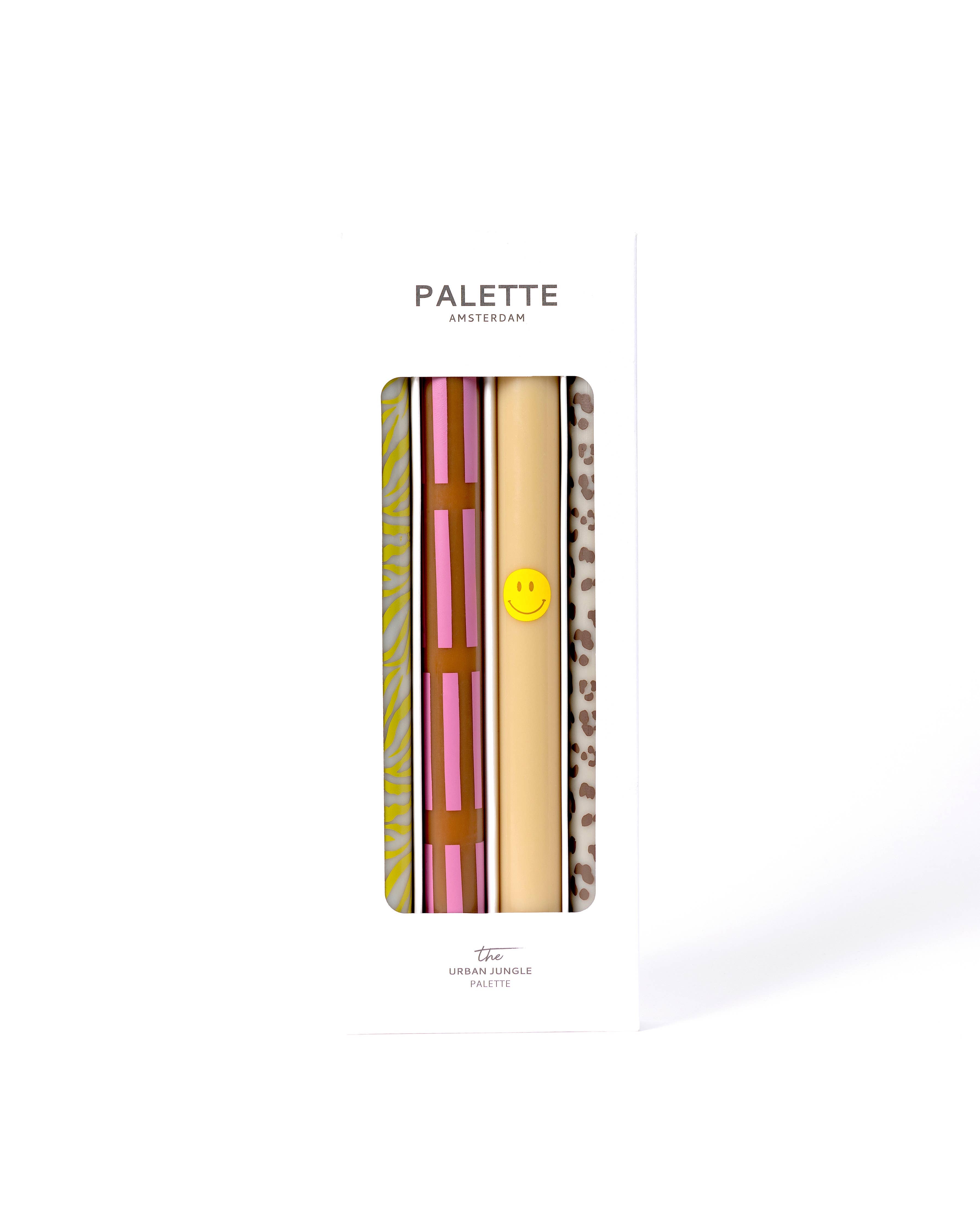 The Urban Jungle Palette is a set of four, tall, dinner candles with exclusively designed design prints in a palette of beige, pink, green and off-white candles, inspired by animal patterns but with a happy vibe & cool colours. Each candle has a different print design of wax. Together, they instantly look beautiful in-store and at home. QUALITY - The candles are low-soot and low-emission. They burn neatly for 9-10 hours, are 25 cm tall, and fit in almost every chandelier. UNIQUE DESIGN - Designed by Maxine in Amsterdam in our signature set style and produced exclusively by Palette. HIGH IN DEMAND - Candle designs with high turnover. I am fortunate to sell many on a daily basis. Will your shop be next? SOCIAL - Buy Light, Give Light. Read more on paletteamsterdam.com Price & package = Set of 4 matching candles in a natural carton, gift-worthy packaging, like the image. Have a look at our other designs too!