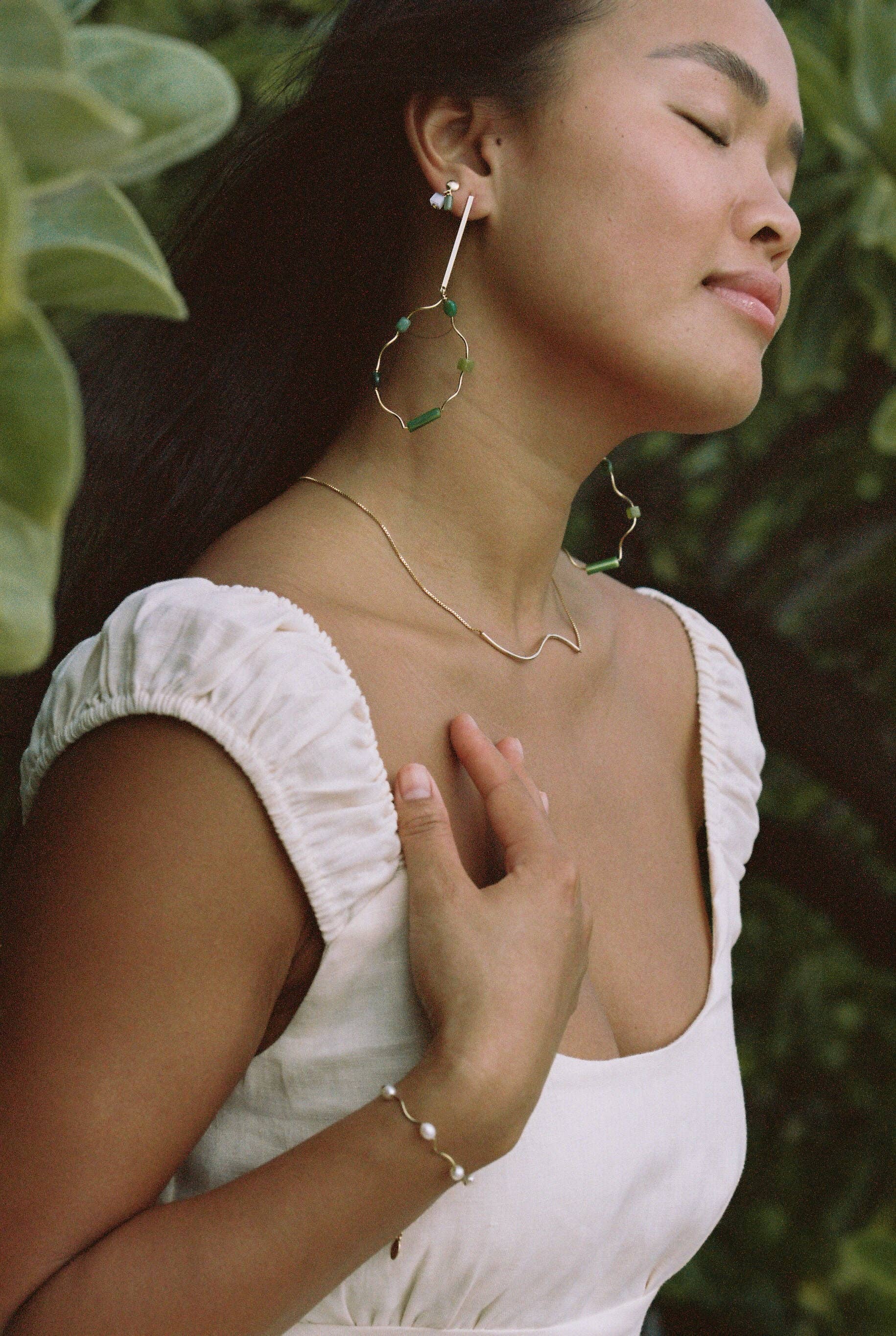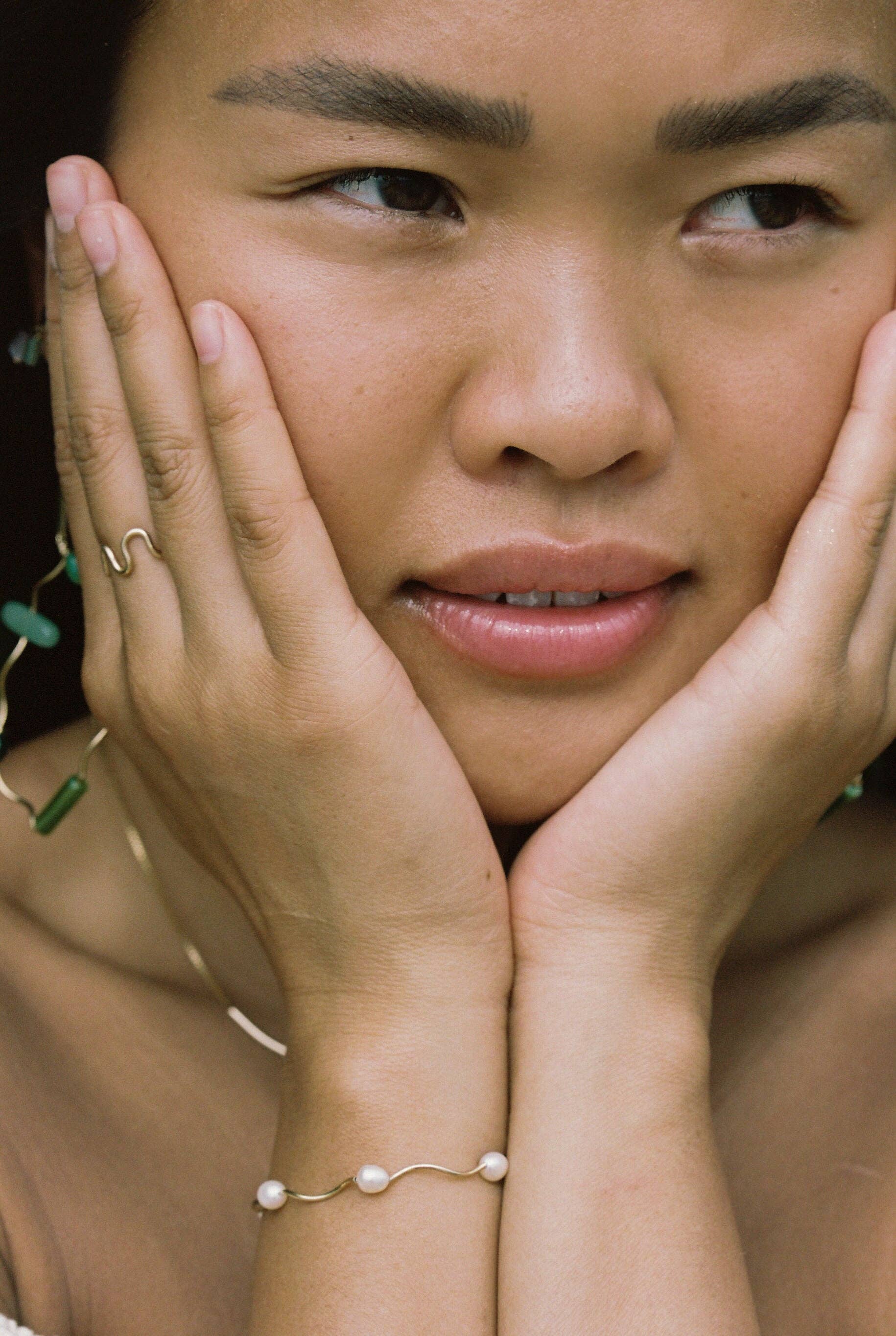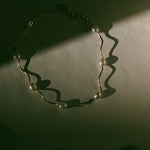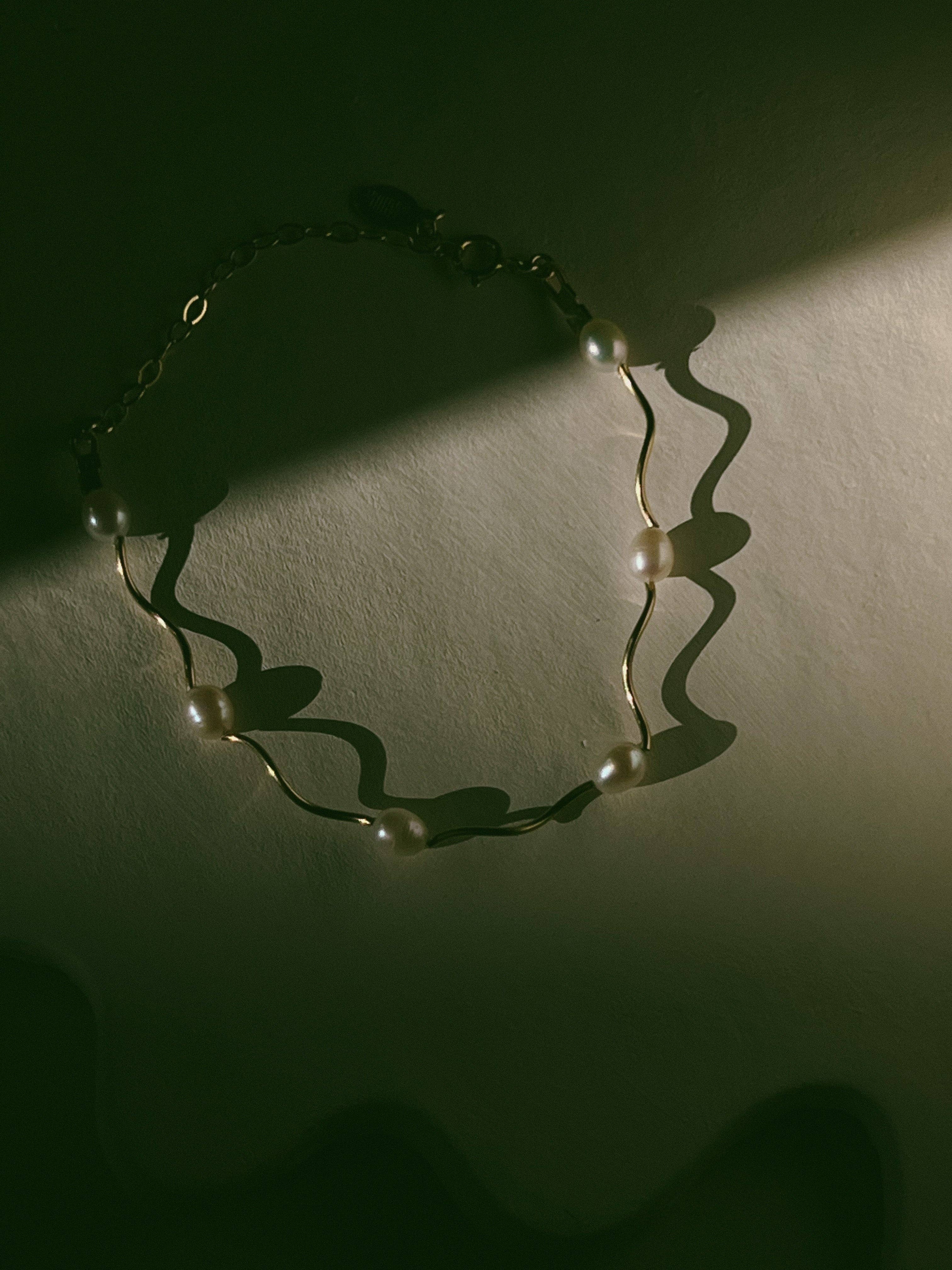 A bracelet with a little twirl and freshwater pearls.