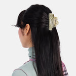 A petite version for a playful touch. This small claw is perfect for all hair types and textures. Made from high-quality acetate; a durable, plant-based bio-plastic. Metal hardware is lead and nickel-free. Slight variations will appear with pattern, color, and form due to the handmade nature of the product. Measures approx 3.5"L x 2"H x 1.5"W. Color: olive checker, silver tone hardware