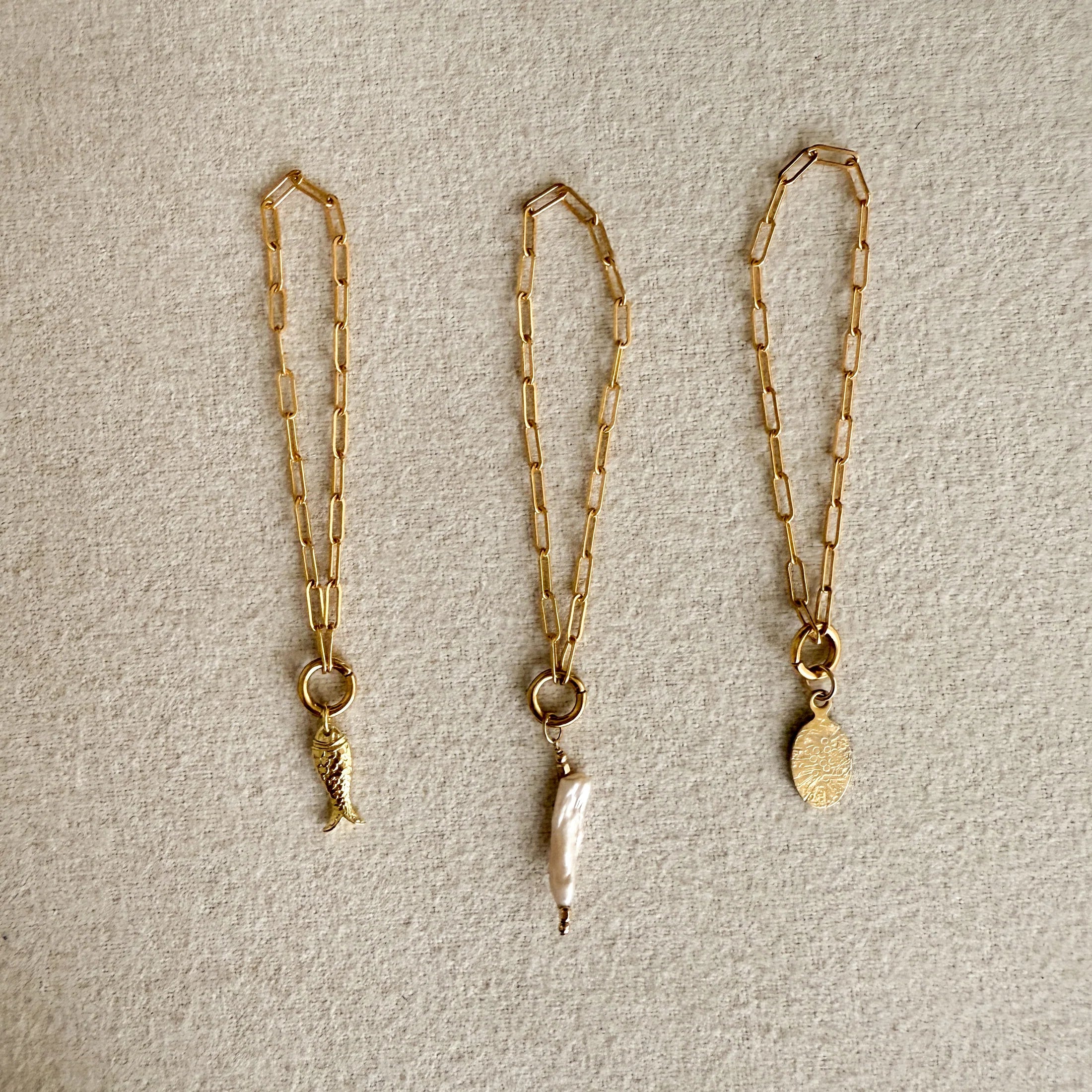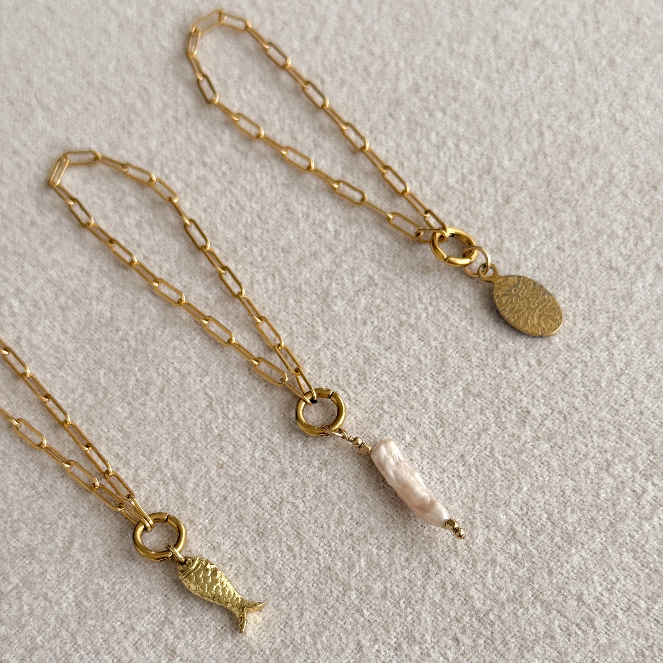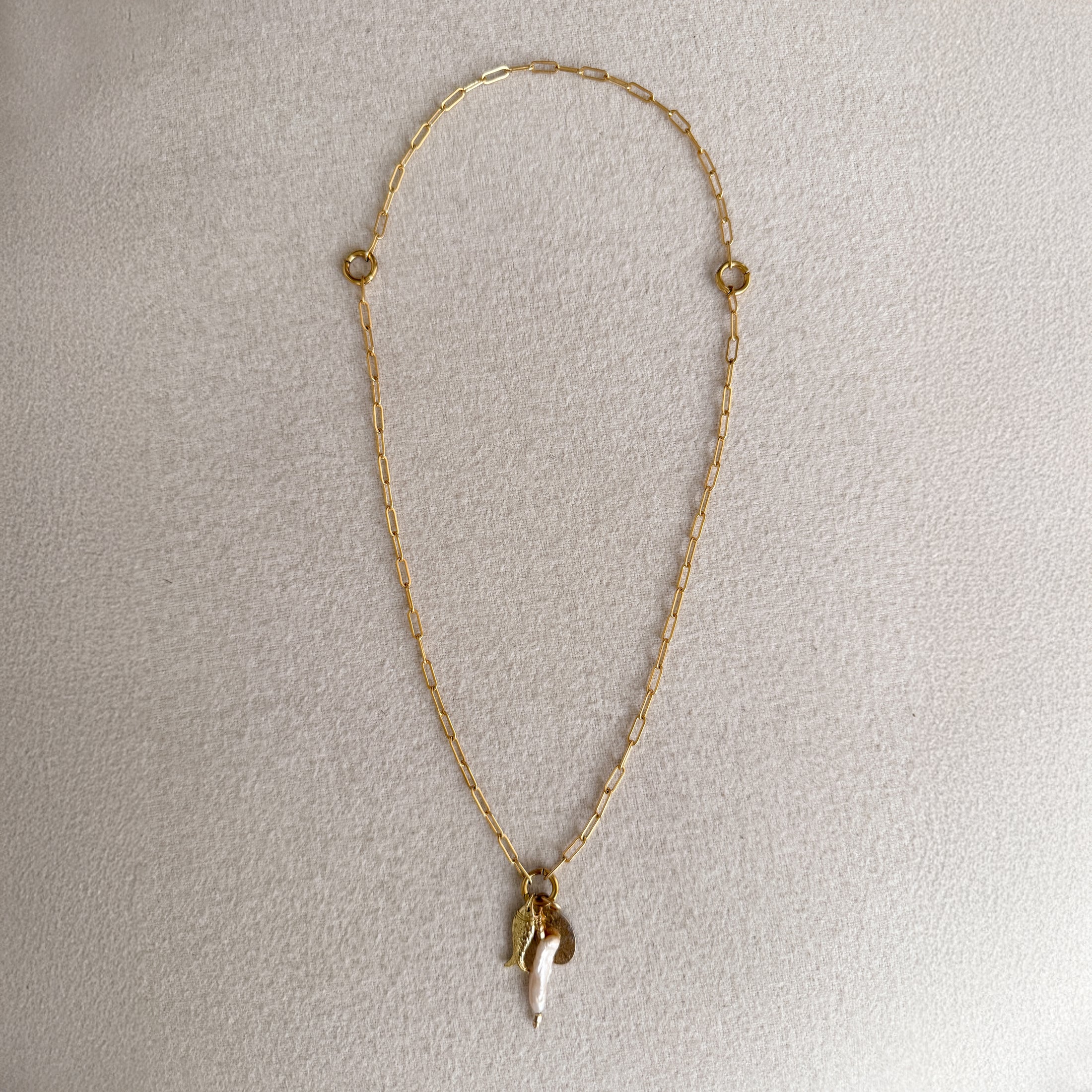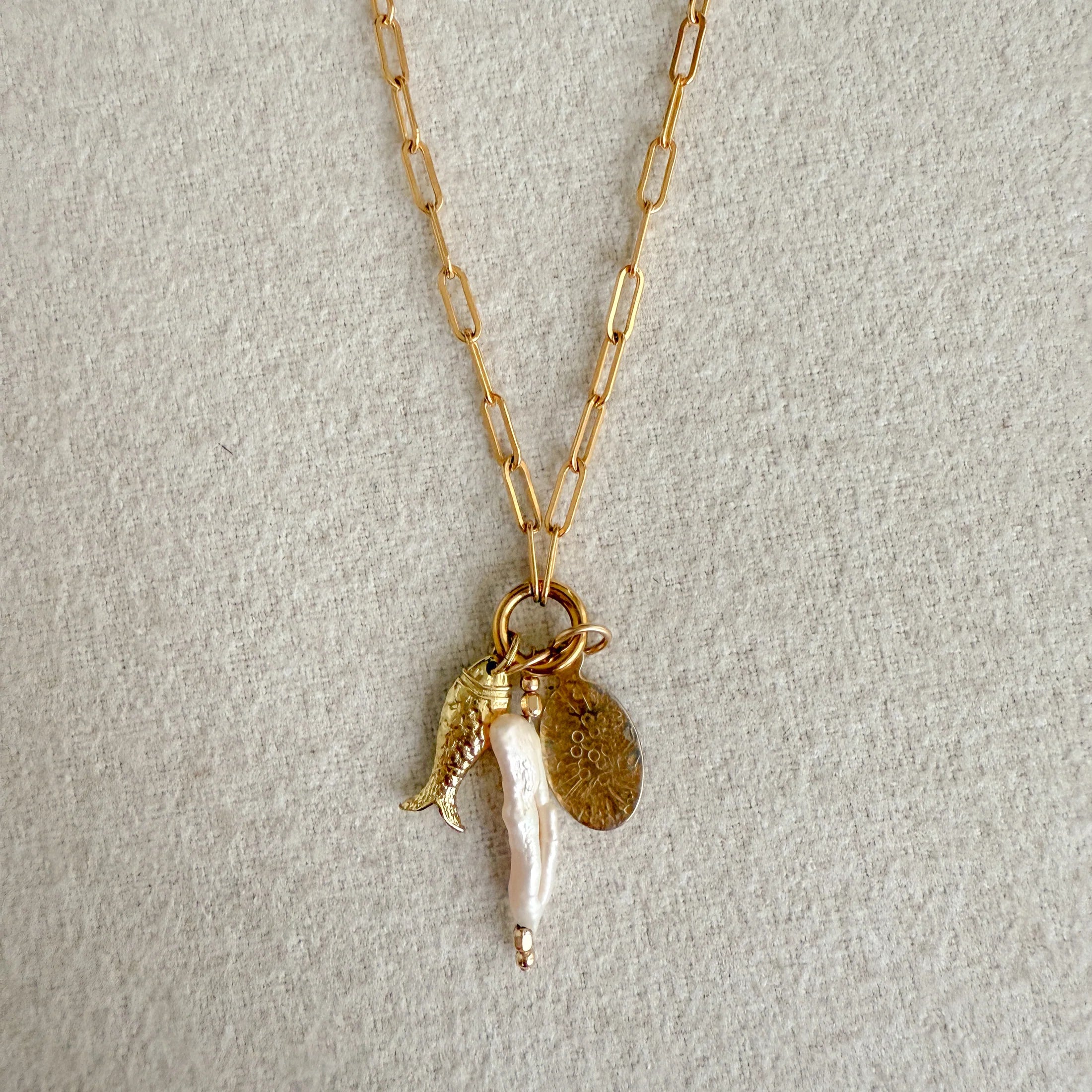Standard charm additions to this piece are a tribute to ocean creatures who have long stood the evolution of time with a hand wire-wrapped Biwa-inspired elongated pearl, a fish charm, and a hand-stamped oval charm inspired by urchin shells.