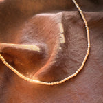 Keep your curiosity alive with the Seek Choker. Crafted in all gold-filled material, this daily luxury piece features symbolic tubes representing your quest to seek everything out in life. Long gold-filled tubes are broken apart with sections of 5 nugget beads that reflect the light in a fascinating way. In numerology, 5 represents the curious explorer, so keep seeking more life, truth, and experiences to help you get to a place you long to thrive in.