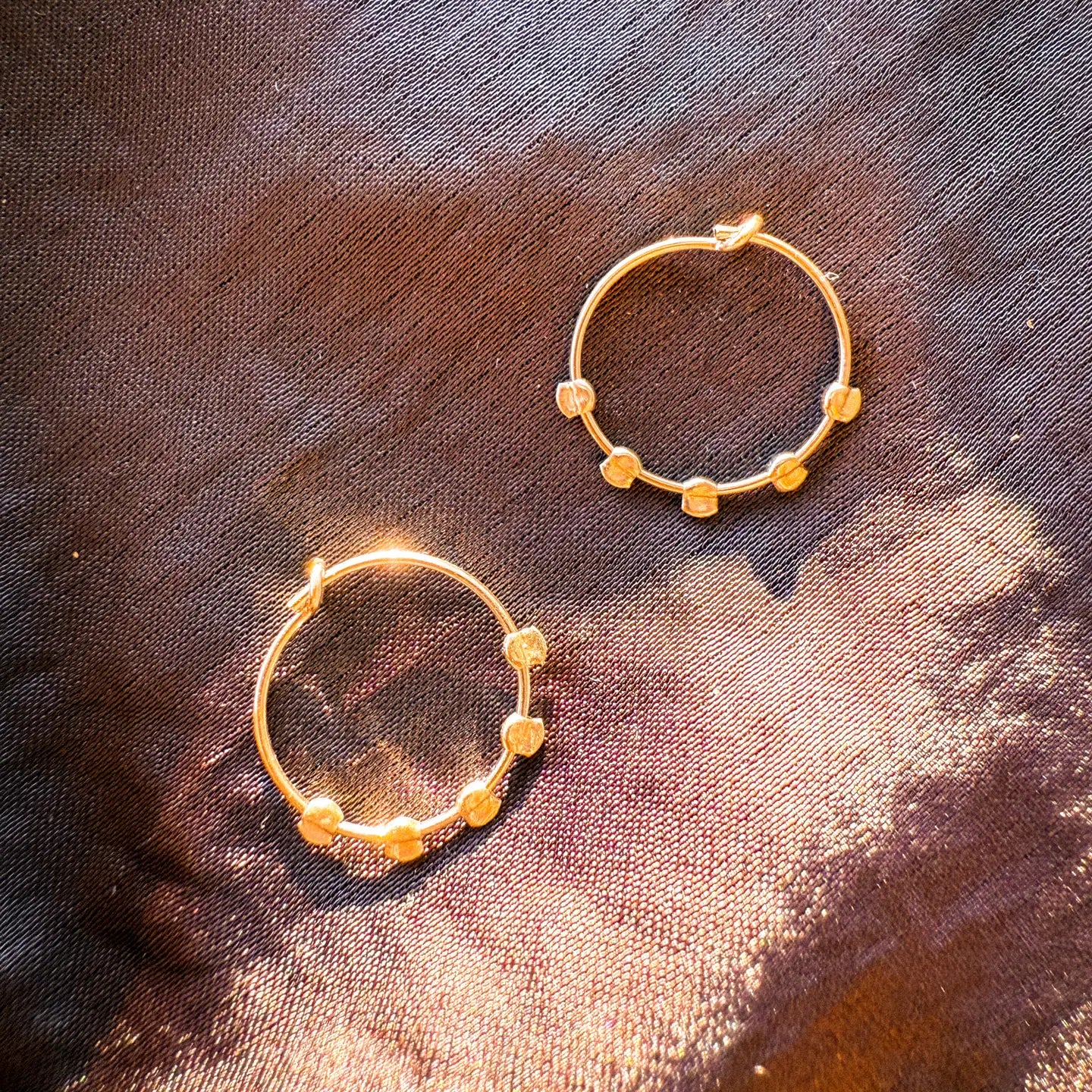 Embrace the moment with the Sense Earrings. These simple, elegant hoops designed for your everyday wear, feature 5 hammered beads, reminding you to engage all your senses: see beauty, hear music, taste flavors, feel textures, and smell scents. Let your senses guide you towards an intentional, heightened experience.