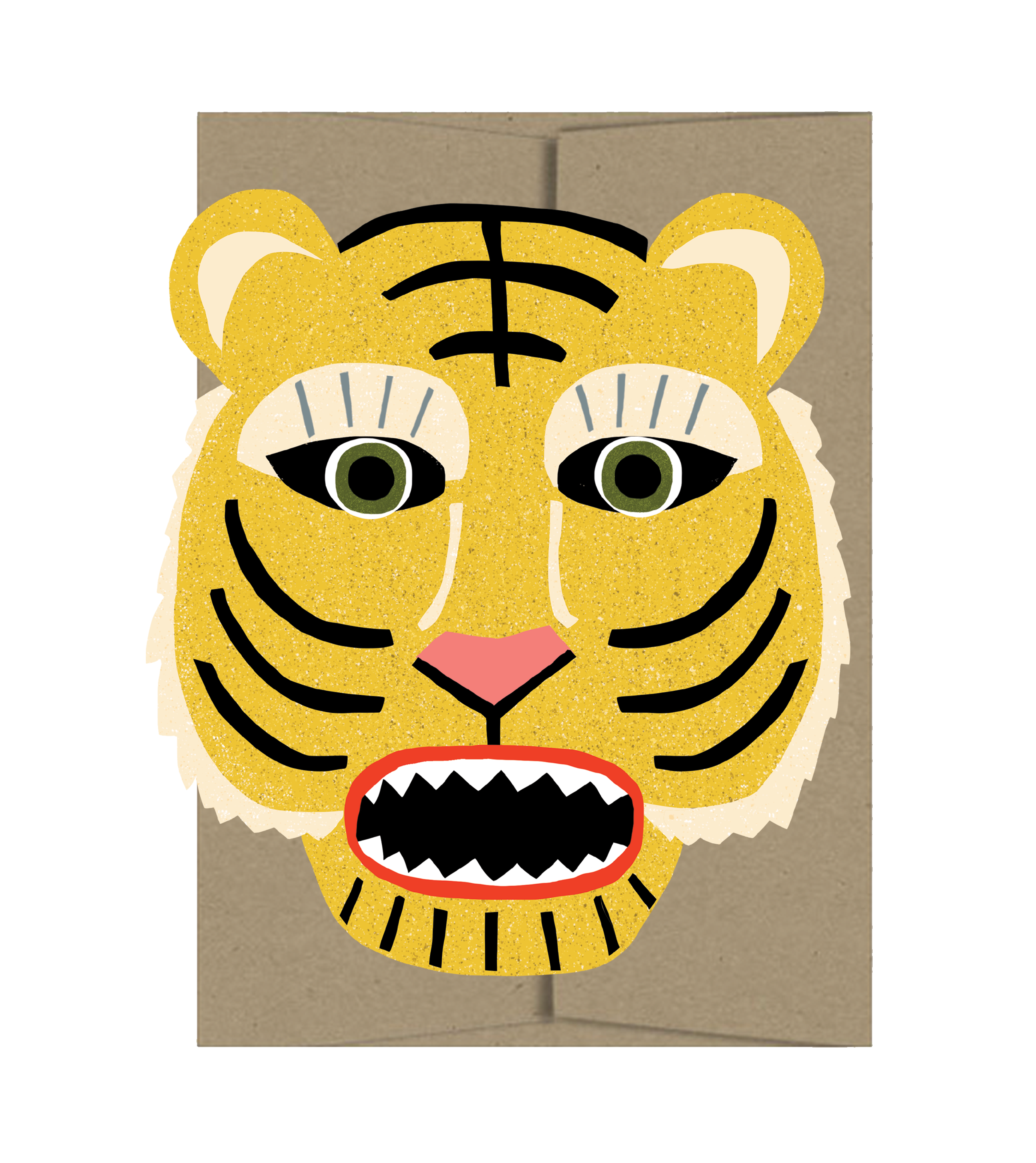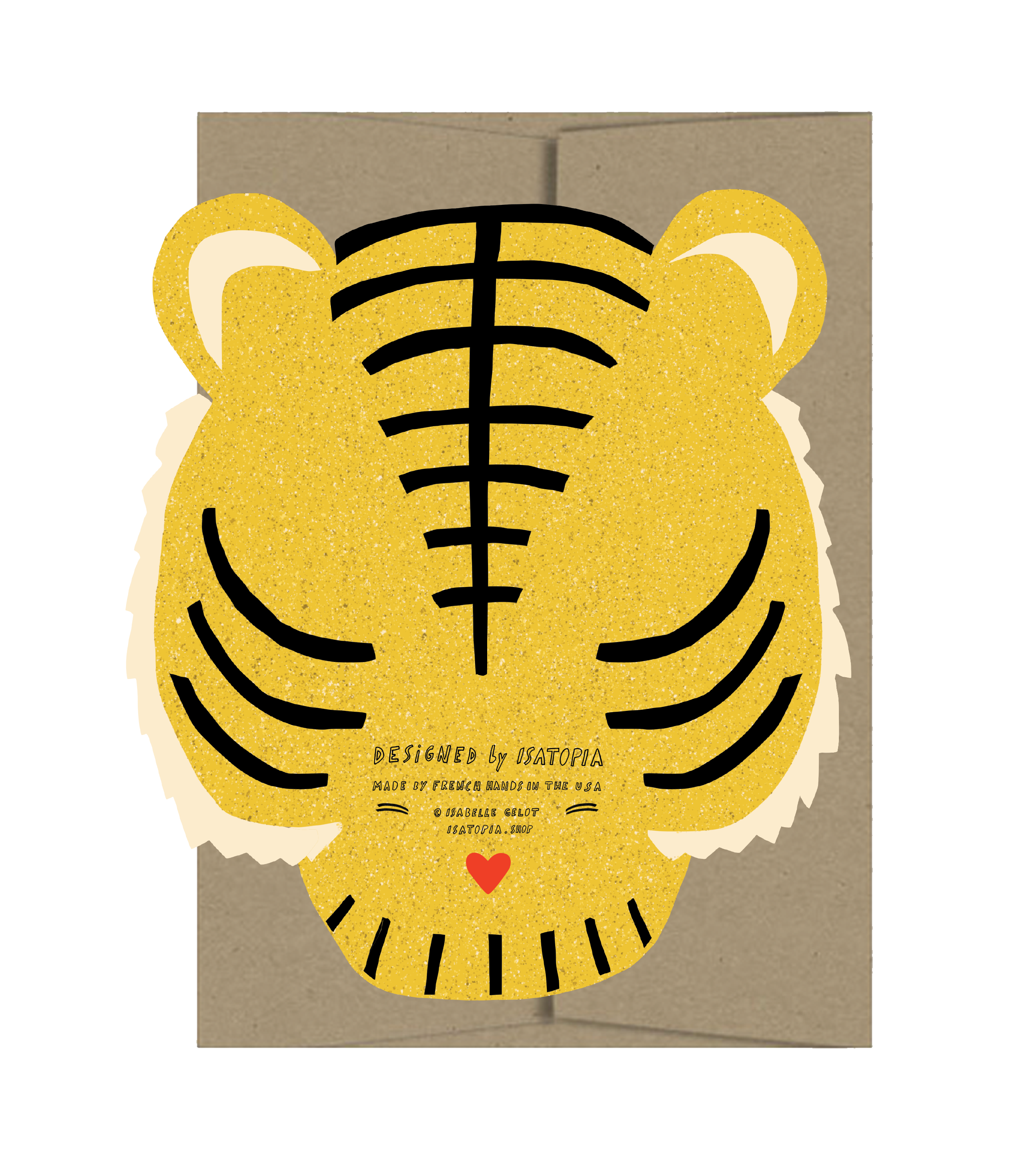 The Tiger card is a bold and fun card — perfect for sending a roar of excitement or inviting little explorers to a fun-filled party! Part of the Wild Bunch Collection - a playful trio of animal cards, perfect for party invites, cheerful notes, or anyone who loves a little fun. A6 - 6.25x4.5" die cut folded card, printed in the USA on sustainably produced 18pt coated card stock. Each folded card is blank inside, comes with a brown kraft recycled envelope and is wrapped in a cello bag. Check the rest of the Wild Bunch collection here Original illustrations by Isabelle. Made by French hands in the USA!