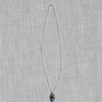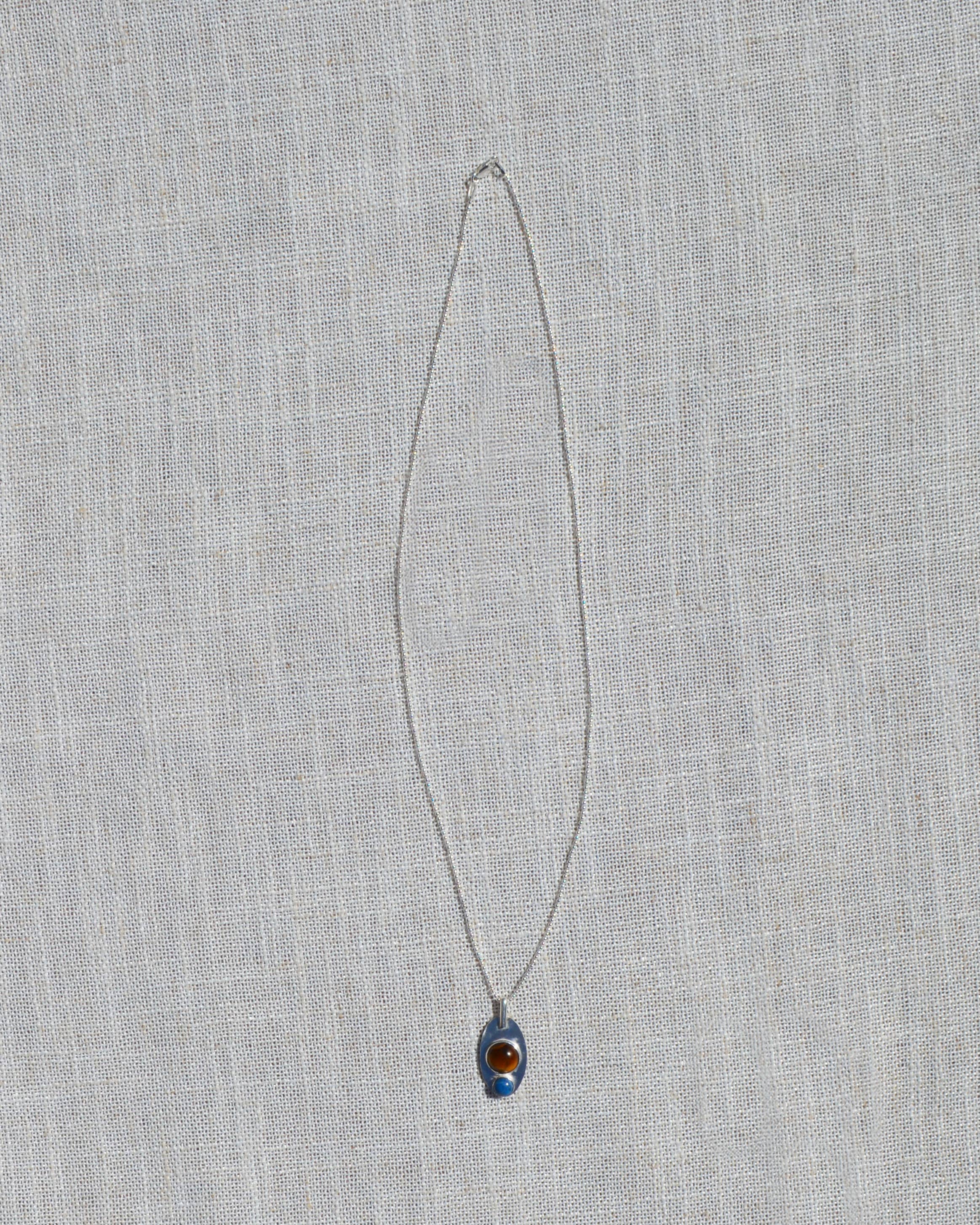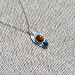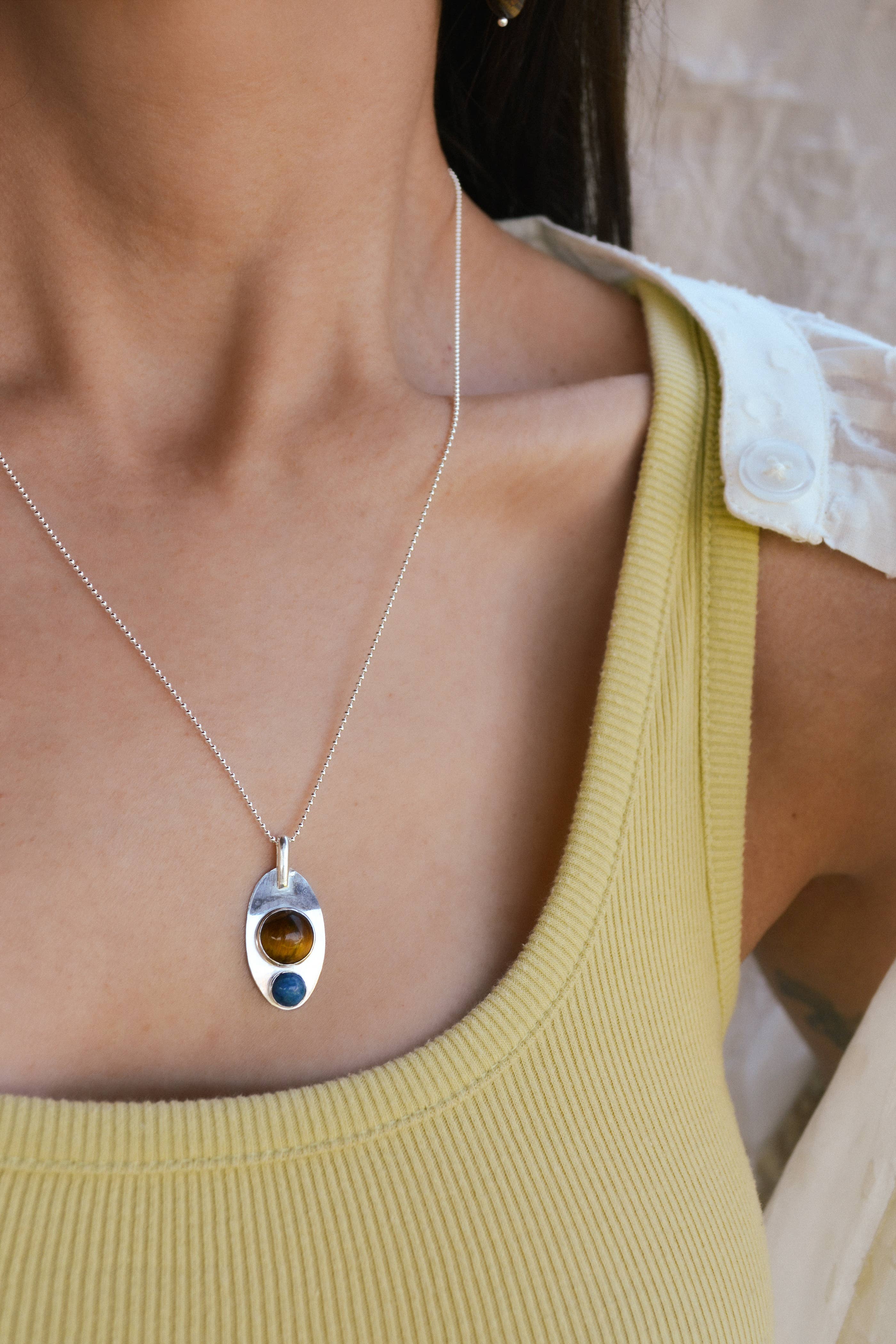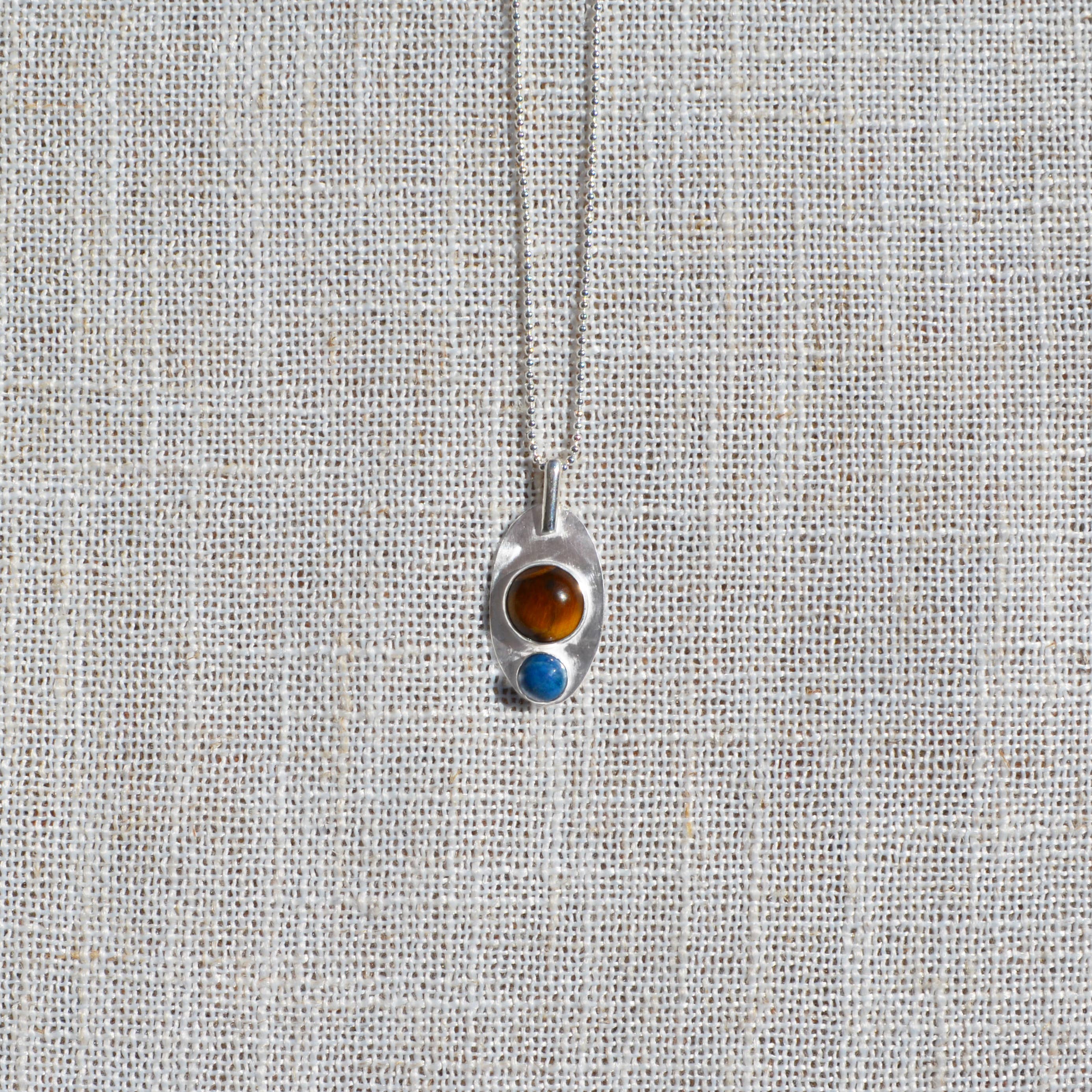 A sterling silver pendant with stone settings - All components, necklace & settings in sterling silver - 20" sterling silver bead chain - Tiger's eye & denim lapis stones *Hand forged and detailed in studio in Denver CO